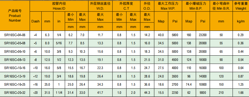 應(yīng)用:較小彎曲半徑的高壓液壓油基和水基液壓系統(tǒng)。優(yōu)異的脈沖和超過 SAE100R2 和 SAE100R16 標(biāo)準要求的彎曲性能。膠管擁有更加緊湊的尺寸和較小的彎曲半徑 2SN 膠管在機械裝配上有更好的性能。