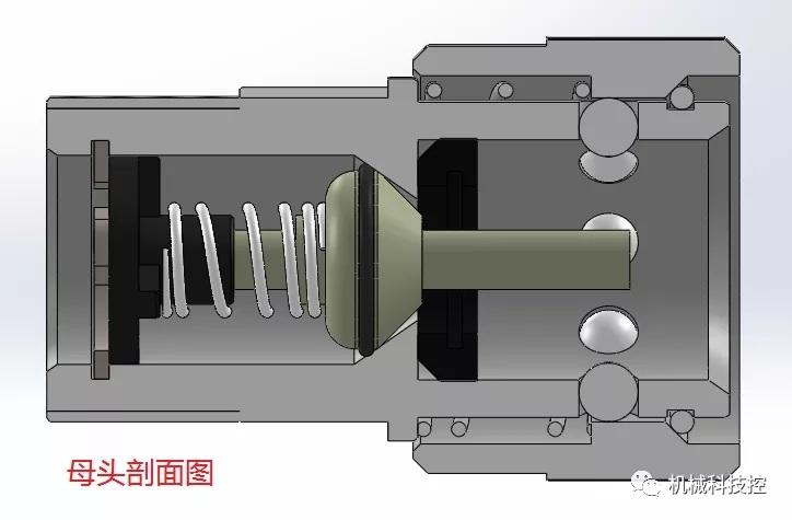 公頭未與母頭裝配時(shí)閥芯在彈簧力的作用下保持封閉,管路不通。公頭一般以螺紋連接的方式固定在閥板上,閥板中的螺紋孔需加密封圈保持密封。